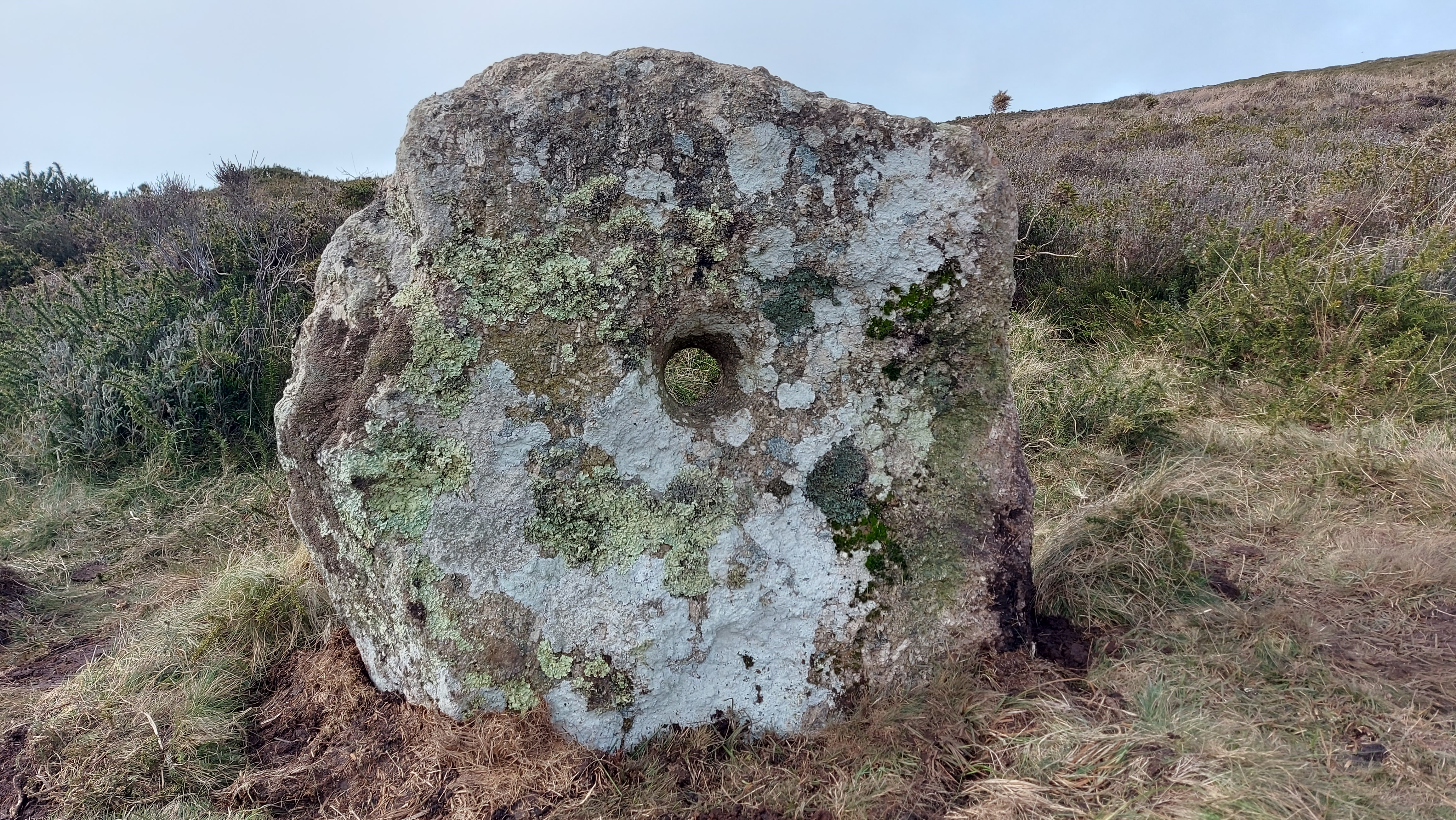 Adjoining the ritual landscape of Tregeseal near St Just, Cornwall lay a curious collection of stones known as the Kenidjack Holed Stones, which are named after the common land on which they are sited (Latitude 50.1360°, Longitude -5.6537°). The site consists of four large granite slabs each perforated with a circular hole currently positioned in a row with an ENE-WSW orientation of 67°, with a further fifth smaller holed stone a few meters to the NW of the main row. The stones are distinctive due to being a collective group with holes, and while there are other examples of holed stones in west Cornwall (including a number near the Merry Maidens stone circle), it is unusual to find a group of them together. It is considered that they are most likely a collected monument which relates to the local Bronze Age barrows, stone circles and other monuments within the immediate location. They were drawn in 1842 by John Buller laying prone on the floor.[1] All the stones have likely fallen and been re-erected a number of times. In 2020 one of the stones became loose and fell over, the hole in which it had sat was very shallow and although it was propped back up it needed to be reset in the ground in a more robust manner. By 2023 a second stone was also becoming loose and this led to the opportunity to examine if there was any evidence of their original positions in the ground immediately surrounding them or if these had been lost. The archaeological investigation was led by Peter Dudley of the Cornwall Archaeological Unit with support from Laura Ratcliffe-Warren and a team of volunteers from the Penwith Landscape Partnership. Historic England grant-funded the work as part of the monument management programme of conservation works.