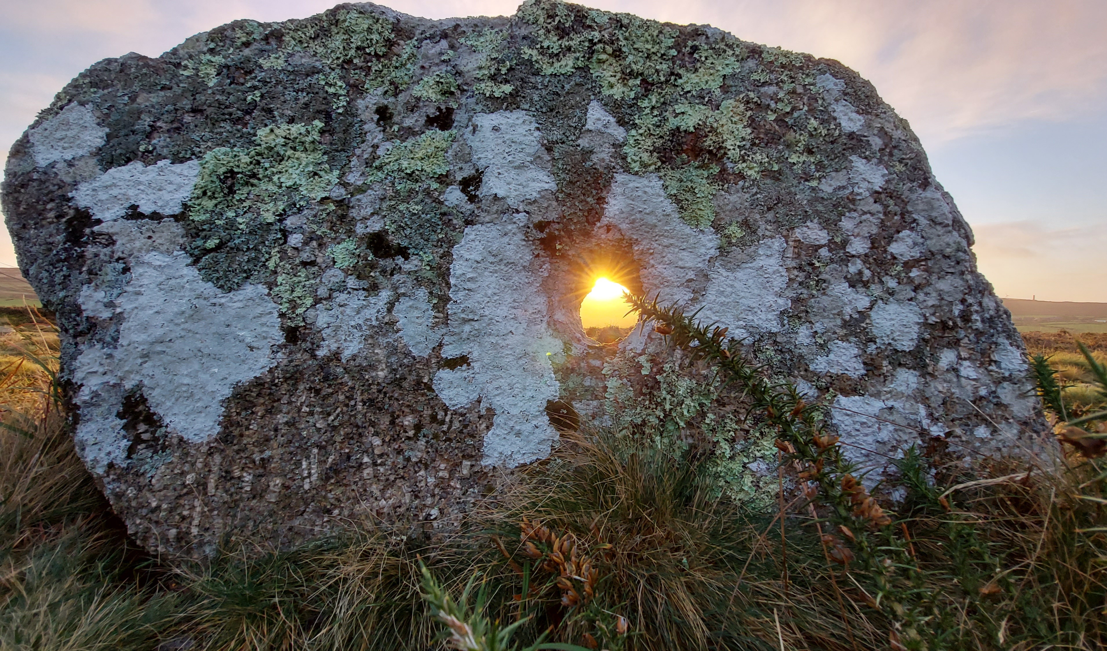 The rising sun will form a circular sun beam onto the stone’s shadow. The connectivity between the sun, stone and shadow may have been of interest to the people who created the holes in the stones. As a phenomenological effect, it could have been perceived as a mastering of the sun itself (a possible deity) by casting it down, bringing it to earth while shrinking it and harnessing its power and warmth at ground level. I can speak from experience when I say that the concentration of sunlight shining through the hole is a great way to warm your hands on a cold morning! Alternatively, It could have been seen as a demonstration of light overcoming darkness, with the sunbeam forming centrally in the dark shadow behind the stone.