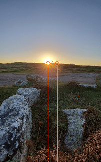 Apart from the orientation of the barrow towards the eastern horizon and the mid-point rising sun. It is worth looking at its situation in the landscape with respect to the extremes of the solar cycle. Much of the horizon is distant seascapes. The Isles of Scilly make an appearance as and when conditions allow; they lie on the WSW at an orientation of 245-257°.