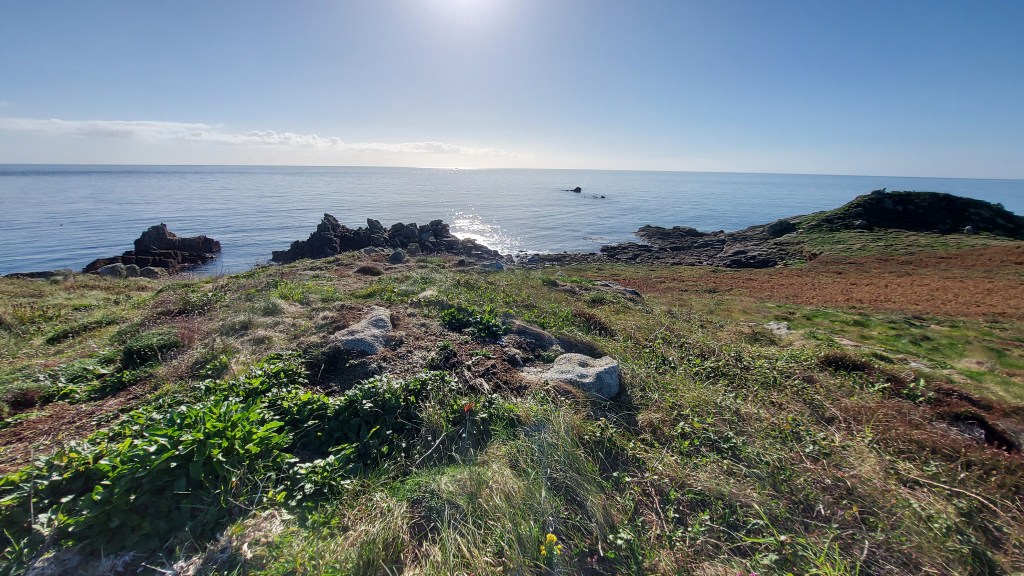 What has been described as a field system boundary runs between the two passage graves along the ridgeway. The HER 7222 entry suggests the graves are linked on the summit by a wall of the field system. There is banking and the system has orthostats spaced 1 – 3 meters apart. Central to these is a slab of stone which stands 0.75m in height. This stone can be seen from large distances away and is a prominent hilltop feature. This prehistoric wall forms the edge of a field system which extends down the hill. The HER record suggests that the ‘clearly visible orthostats are due to the lack of superficial lynchetting’. This in turn raises the question could the orthostats have been deliberately left as a prominent feature? and what if this summit row of stones has a duel purpose and acts not only as the highest extent to the field system but is also an interconnecting stone row between the passage graves and cairns. This would be in keeping with the stone rows which run between the passage graves on Kitten Hill, Gugh. If so it would make a fascinating addition to what is already an incredible ritual landscape.